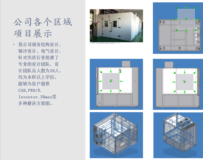 本公司一贯注重产品的研发及质量控制, 公司拥有工程技术人员、高级工程师、工程总监等多方面专业人员,各工种专业技术人员达总人数65%以上。多年来公司从“管理严谨,技术求精”的角度出发,筑百年企业、永续经营一贯奉行诚信认真的工作态度,以高效、服务为众多企业单位、科研院所提供了恒温恒湿系列产品、高温老化系列产品、烘干固化系列产品、节能净化系列产品、新兴农业整场输出项目,为企业赢得了市场且迅速发展壮大,另外,为满足日益增长的市场需求,更好地为客户提供好的服务,本公司已在华东、华南、东南、华北成立分公司或办事处,业务服务网络覆盖到全国各个地区。